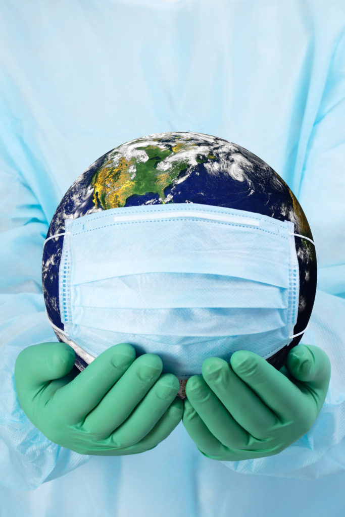 A DSLR photo of doctor's hands in gloves holding the planet Earth in a medical mask. Space for copy. Earth globe image provided by NASA - https://visibleearth.nasa.gov/view.php?id=54388