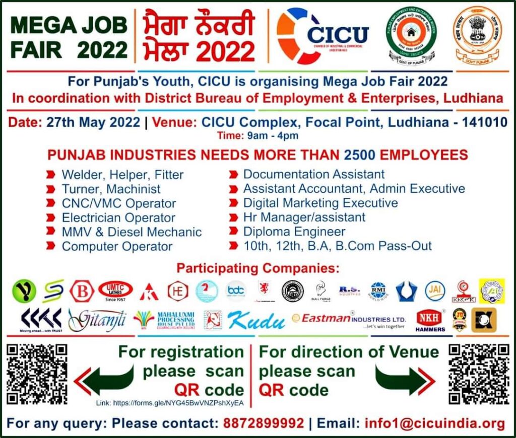 District Bureau of Employment and Enterprises (DBEE), Ludhiana in association with Chamber of Industrial & Commercial Undertakings (CICU) is organizing Mega Job Fair in Ludhiana’s Focal Point on 27th May 2022.This has been informed by the district administration