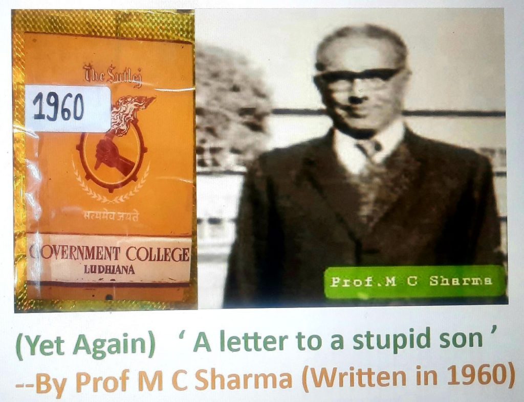 Professor M C Sharma has been a very popular teacher in his times at Government College, Ludhiana ( Now Satish Chander Dhawan Govt. College, Ludhiana ) . The above article has been taken from the college Magazine The Sutlej 1960 Edition with due permission from college librarian to preserve the rich heritage from withering pages and print from archives.
